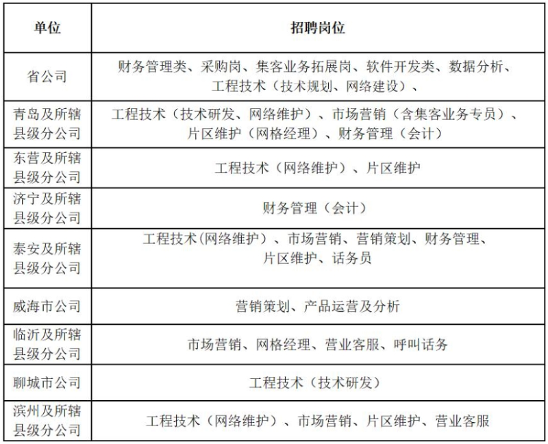本次招聘涉及省、市、县公司软件开发类、工程技术类(含技术研发、网络维护、技术规划、网络建设等)、数据分析、财务管理类、市场营销(含集客业务拓展等)、营销策划、片区维护(网格经理等)、营业客服、呼叫话务等9大类77个岗位。详见附件《招聘岗位及有关要求》。