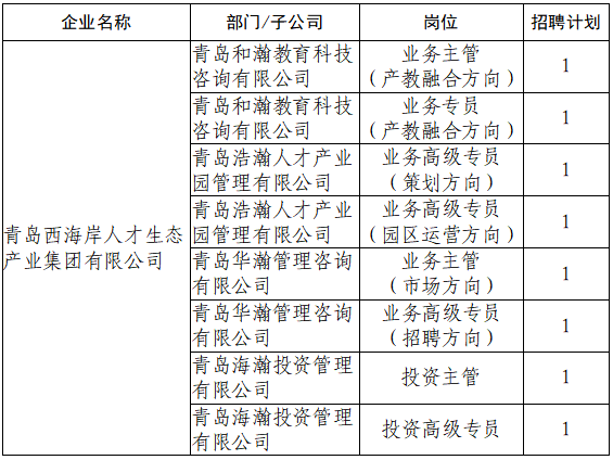 请登录“青岛人才网”(http://rc.qingdao.gov.cn),查看“青岛西海岸人才生态产业集团有限公司”招聘公告。