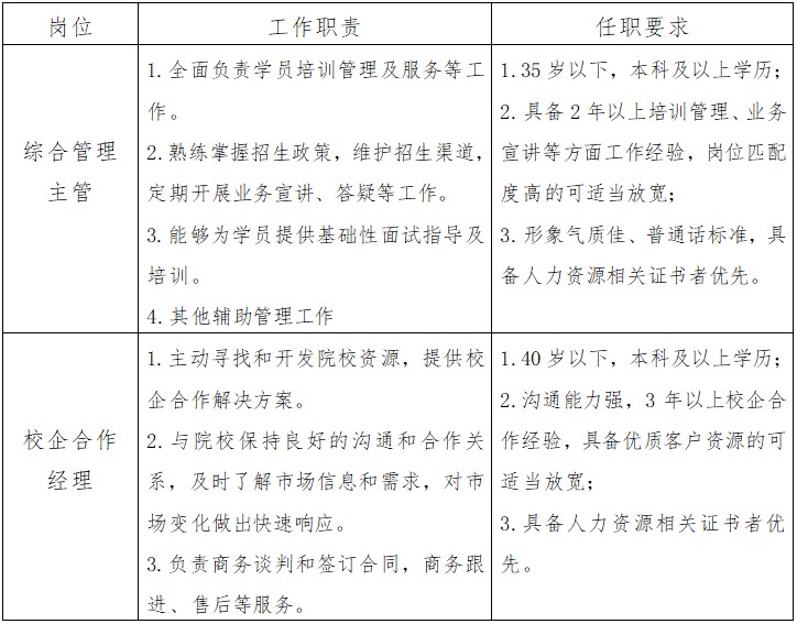 综合管理主管、校企合作经理各1名。